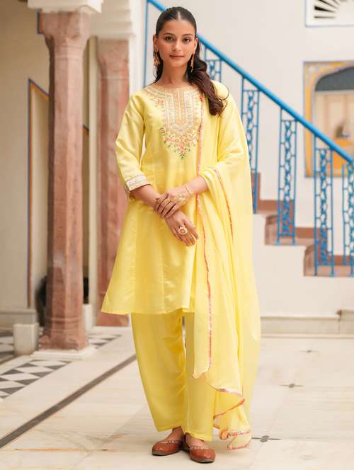 - Find gorgeous sets of ethnic wears in trending designs in yellow colors suitable for festive wear of occasions.