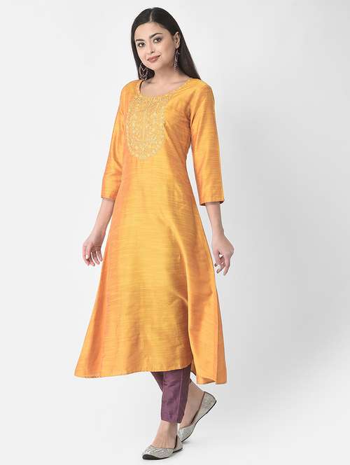 - Grab this beautiful kurta made up of silk fabric featuring round neck designs.