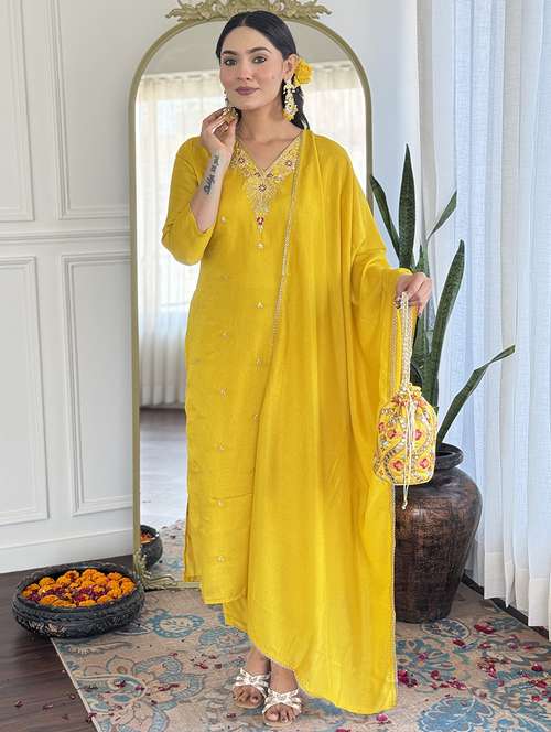 women solid with work three quarter sleeve kurta pant with dupatta set - 21989897 - Very Small Image - 1
