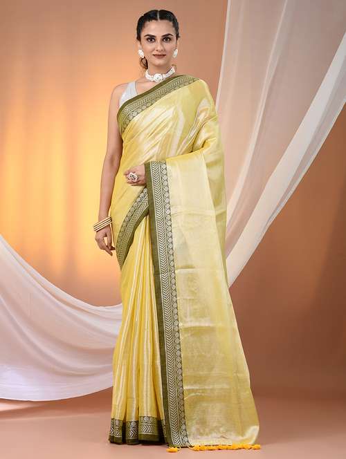 Our Yellow Shimmer Tissue Saree With Nakshi Borders, is a stunning embodiment of timeless beauty and cultural heritage. Crafted from luxurious tissue fabric, this saree epitomizes the artistry and craftsmanship of traditional Indian weaving techniques.