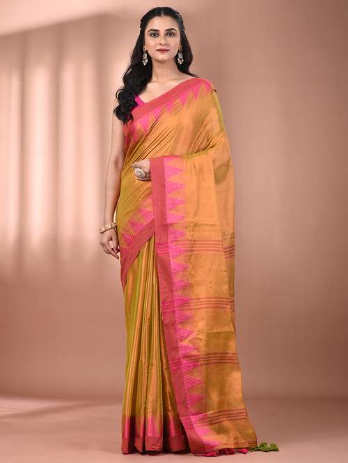 A saree that spells elegance and beauty. This saree hugs your curves to give you an alluring look. The captivating color, the sheen texture is everything you will need this season. Style this up with oxidized jewelry for a fab look!