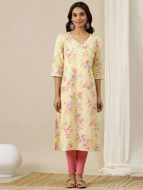 - » women yellow floral printed straight kurta