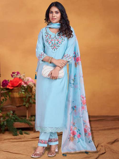 - Browse through the latest range of ethnic sets for women with tailored sleeve designs with embroidered works.
