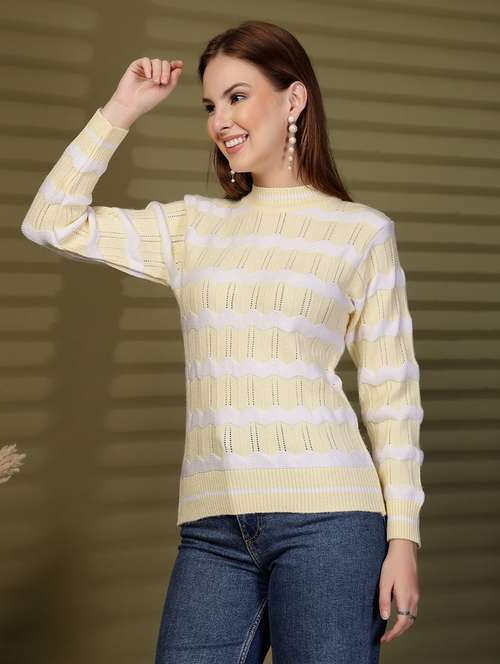 Stay cozy and stylish with this chic Lemon & white zig-zag patterned knit sweater. Designed with a comfortable high neck and full sleeves, this sweater is perfect for layering in the winter season. The ribbed hem and cuffs ensure a snug fit, while the soft knitted fabric provides warmth and ease of movement. Pair it with trousers, jeans, or jeggings for a casual yet trendy winter look.